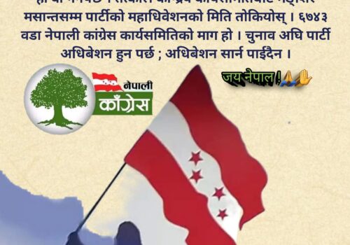 बवियु,नारी वाटिका संवाददाता गर्न । धादिङ -२८ कार्तिक । नेपाली काँग्रेसमा १५ औं महाधिवेशन बारे सहमति जुट्न नसक्दा नेतृत्वहरुबिच विवादै विवाद जारी छ । शिर्ष नेताहरुबिच यस बारेका कुनै टूंगो लगाउन नसकेको अवस्थामा नेपाली कांग्रेसको केन्द्रीय कार्यसम्पादन समिति बैठक आज बस्दैछ। बैठक आज दिउँसो एक बजे... विस्तृतमा