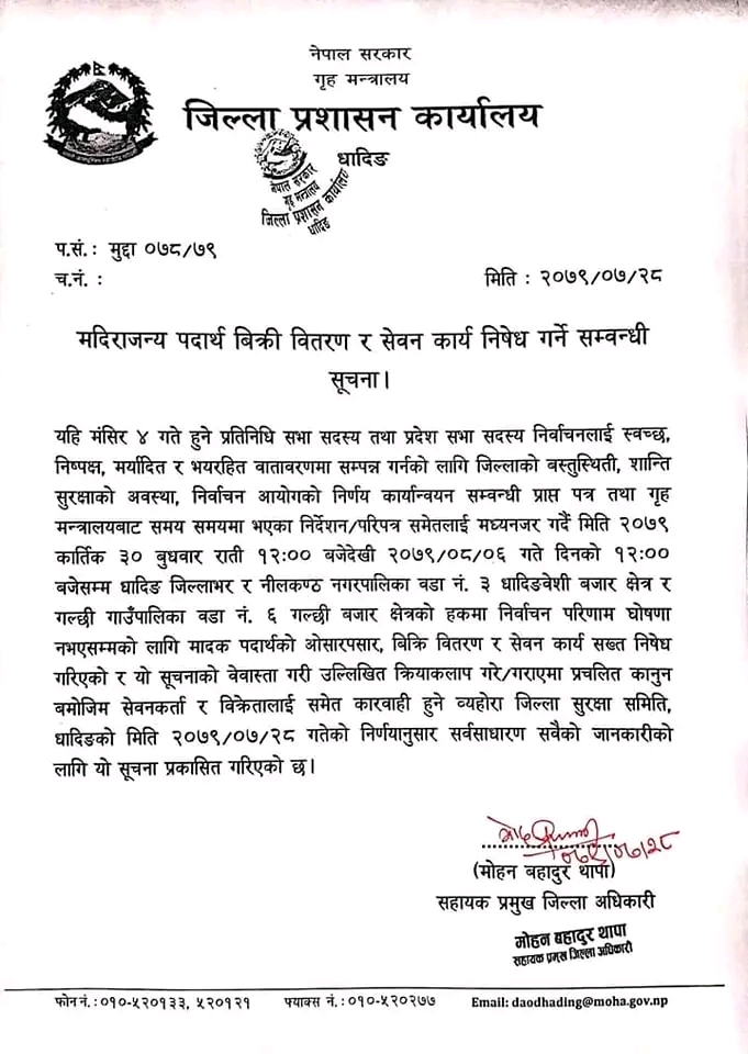 धादिङ – निर्वाचन नजिकिएसँगै धादिङमा भोली रमति १२ बजेदेखि मदिराजन्य पदार्थ सेवन तथा विक्रि वितरणमा रोक लगाईएको छ । आसन्न निर्वाचनलाई लक्षित गर्दै जिल्ला प्रशासन कार्यालय धादिङले मदिराजन्य पदार्थ विक्री वितरणमा रोक लगाएको हो ।