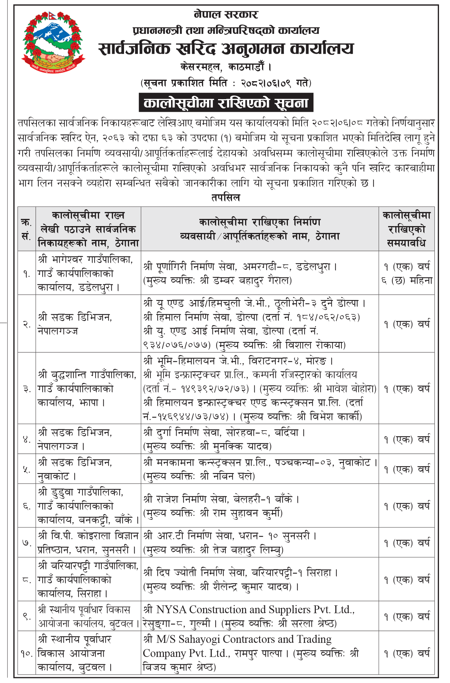 सार्वजनिक खरिद अनुगमन कार्यालयले बिहीबार एक सूचना जारी गरी असोज ८ गतेको निर्णय अनुसार कालोसूचीमा राखिएका निर्माण कम्पनीको सूची सार्वजनिक गरेको हो।
