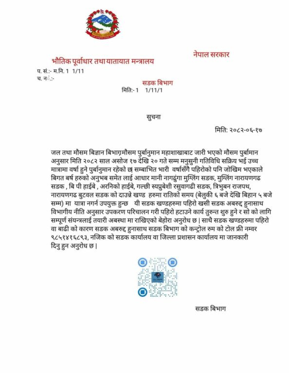 जल तथा मौसम विज्ञान विभागले असोज १७ देखि २० गतेसम्म देशभर मनसुन सक्रिय भई अत्यधिक वर्षा हुने पूर्वानुमान जारी गरेसंगै सडक विभाग,विपत् प्राधिकरण लगायतले पहिरोको उच्च जोखिम रहेका सडकखण्डहरूमा अत्यावश्यक बाहेक यात्रा नगर्न आग्रह गरेका छन्।