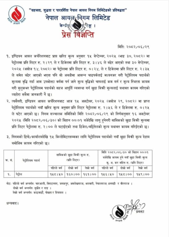 पेट्रोलको मूल्य घटेसँगै पेट्रोल पहिलो वर्गका लागि प्रतिलिटर १५८ रुपैयाँ ५० पैसा, दोस्रो वर्गका लागि १६० रुपैयाँ र तेस्रो वर्गका लागि १६१ रुपैयाँ तोकिएको निगमले जनाएको छ ।