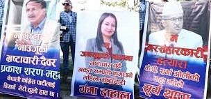 प्रकाश महत‚ सूर्य थापा र गंगा दाहालको ब्यानर राखेर प्रदर्शन