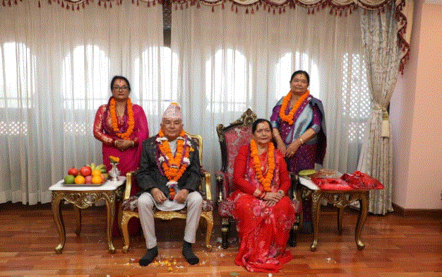 राष्ट्रपति पौडेलद्वारा बहिनीहरूको हातबाट शुभसाइतमा टिका ग्रहण