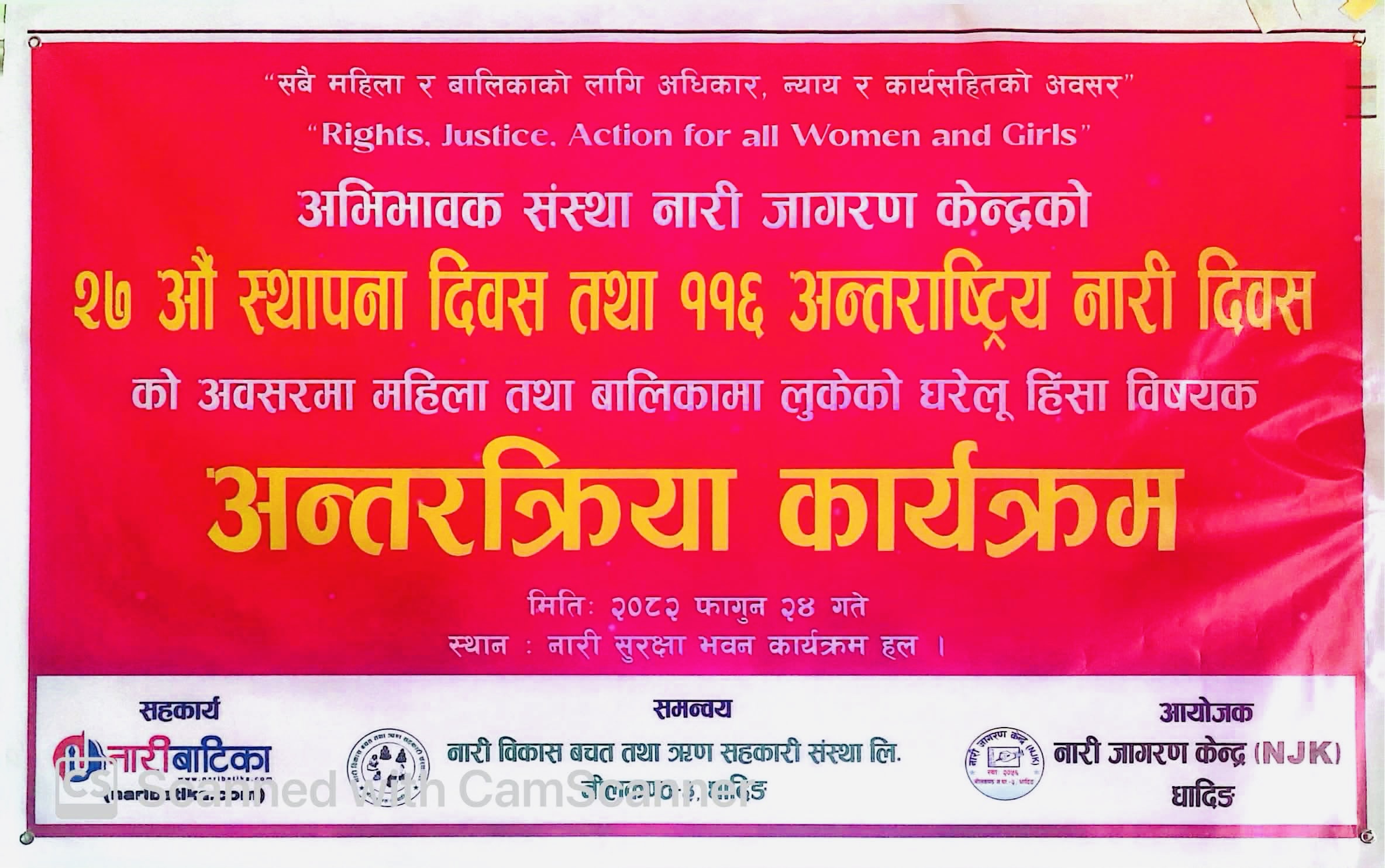 यसै दिवसका अवसरमा नारी जागरण संस्थाले ११६औं अन्तर्रराष्ट्रीय नारी दिवसको सन्धर्वमा संस्था अन्तर्रगतका समितिका पदाधिकारीहरु,कर्मचारीहरु,समुह तथा समुदायका महिलाहरुलाई सहभागी गराई घरेलु हिंसा तथा लैंगिक हिंसाविरुद्धको सचेतनामुलक कार्यक्रम गरी मनाएको छ ।