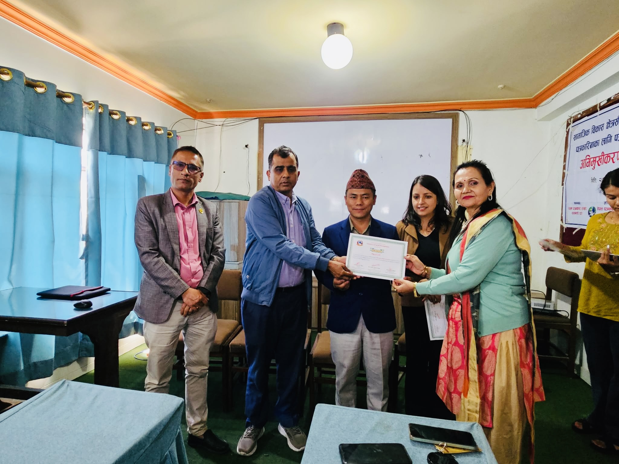 सामाजिक विकास मन्त्रालयका सचिव खुविराम अधिकारीको अध्यक्षतामा सम्पन्न कार्यक्रममा नेपाल पत्रकार महासंघ बागमती प्रदेशका अध्यक्ष कृष्ण सारु मगर, नेपाल पत्रकार महासंघ जिल्ला शाखा काभ्रेका अध्यक्ष विनोद न्यौपाने, प्रशिक्षक सरिता दाहाल तथा प्रशिक्षक नितु पण्डितको आतिथ्यता रहेको थियो ।